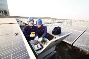 近年来,可节省用地,又可为企业、家庭提供清洁能源的分布式光伏发电在山东各地逐渐升温。截至12月21日,山东分布式光伏发电并网项目已超200个,并网发电容量近13.5万千瓦。图为当日在山东宏力艾尼维尔公司厂房空地上,潍坊供电的工作人员在检查分布式光伏板的运行情况。
