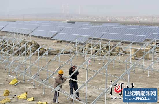 12月9日,工人们正在安装太阳能光伏发电的支架。由晶科电力有限公司投资6亿元建设的60MW太阳能光伏电站及配套设施落户张家口市察北管理区,其中2014年完成20MW太阳能光伏发电建设任务,并向农光互补、农电一体化方向发展。2015年全部完成建设,建成后预计年均发电量1亿千瓦时,年可实现利税2000多万元、节约标煤2万余吨。