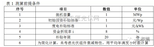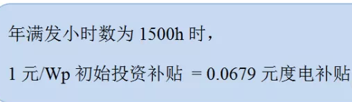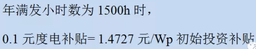 当平均年满发小时数为1500h时,1MWp项目平均年发电量为150万kWh;如果这150万kWh的电,每度获得0.1元的补贴,则相当于首先获得了147.27万元的补贴,即1.4727元/W。简单说,就是: