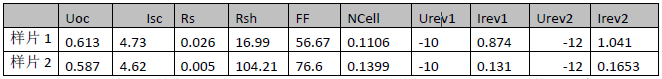 两片电池效率分别为11.06%和13.99%,Isc 分别为4.73A 和4.62A,均明显偏低;而此类正常电池片效率一般为17.5%左右,Isc 为5.3A 左右。
