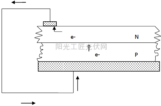 在p-n结中空间电荷区E将电子吸引到n区同时将空穴吸引到p区一边。图2-2描述了短路情况下理想的电荷流动。实际上一些电子空穴对如图2-3所示在被收集前会复合消失。