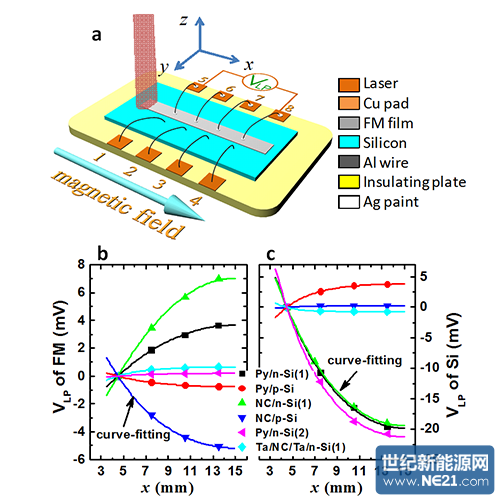 a)实验装置示意图。通过超声焊接连接 Cu 片与铁磁金属样品。b) 磁性金属与Si各自的横向光伏电压和测量电极间距之间的关系。符号是实验数据,实线是理论计算结果。激光功率为 30 mW,波长为650 nm。