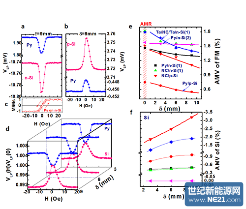他们发现,利用磁性金属和半导体构成肖脱基结,当以光激发非平衡载流子时,半导体中的电子和磁性金属中的空穴通过界面势垒和库仑相互作用形成电子-空穴对。当磁场影响磁性金属的载流子时,同时影响了半导体中电子的扩散行为,进而产生一种新型的磁效应,导致磁性金属与半导体各自的横向光伏电压随磁场发生变化。研究发现,在4Oe下磁性陂莫合金中的横向光伏变化约为1%,接近坡莫合金的本征各向异性磁电阻;有意思的是,在半导体Si上也观察到了横向光伏效应随磁场的变化,且相对变化幅度远远高于坡莫合金,最高可达3.5%,从而实现了Si中电子过程的低磁场调控。进一步,他们确定了影响半导体磁场效应的关键因素,为半导体磁场效应的设计与调控给出了理论指导。除横向光伏效应,他们还首次发现了由非平衡载流子扩散在陂莫合金中形成的平面霍尔效应。这些工作,为半导体磁调控拓展了新的研究空间。这一工作发表在Advanced Materials 上 【Adv. Mater. DOI: 10.1002/adma.201403868】。相关研究得到了国家自然科学基金委员会、科技部和中科院有关基金的支持。