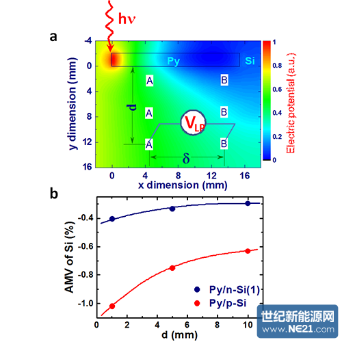 a) 利用有限元模拟得到的Si中电势在x-y 平面上的分布。b) 磁各向异性光伏效应随电极间距的变化。