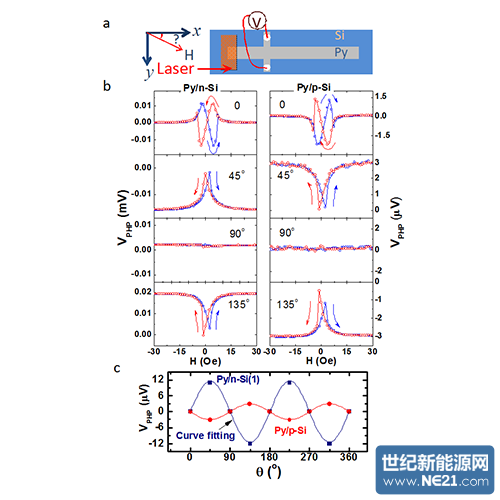 a) 实验装置示意图。坡莫合金条带的宽度是 0.2 mm。b) 非平衡载流子扩散产生的平面霍尔效应。图中数字为磁场与陂莫合金条带之间的夹角。c) 平面霍尔电压随着上述角度的变化。索比光伏网 https://news.solarbe.com/201412/28/202794.html