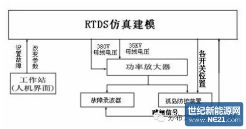 一种基于RTDS的光伏并网系统防孤岛保护装置测试平台,所述平台依托RTDS仿真器及外部设备,构建测试平台,搭建测试系统仿真模型,实现对光伏并网系统的测试;所述测试仿真模型中,特别设计了光伏列阵的MPPT控制模型和V/Q控制模型。测试平台由仿真系统工作站、RTDS仿真器、功率放大器、孤岛防护装置及故障录波器构成。所述平台通过搭建光伏并网测试V/Q控制模型和MPPT控制模型,实现了防孤岛保护装置动态测试。该光伏并网系统仿孤岛保护装置测试平台,利用RTDS/RSCAD建模并仿真,采用V/Q控制方式实现光伏并网控制,不需采用锁相控制技术,简化了控制系统设计,能准确实现功率因数可调,控制效果好。
