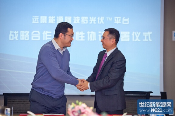 上图:远景能源光伏业务负责人战略业务总监孙捷先生(左)与TÜV SÜD光伏业务总监许海亮先生(右)签署战略合作意向协议
