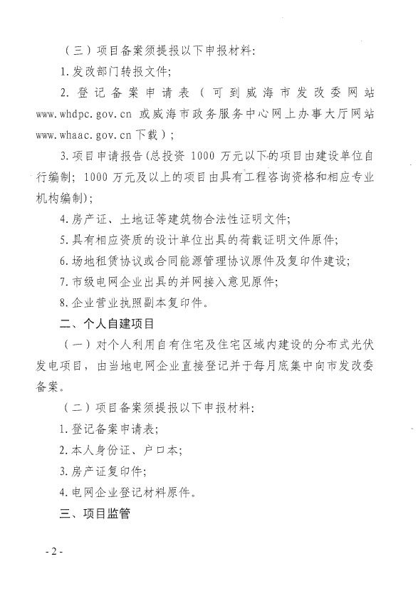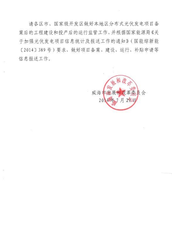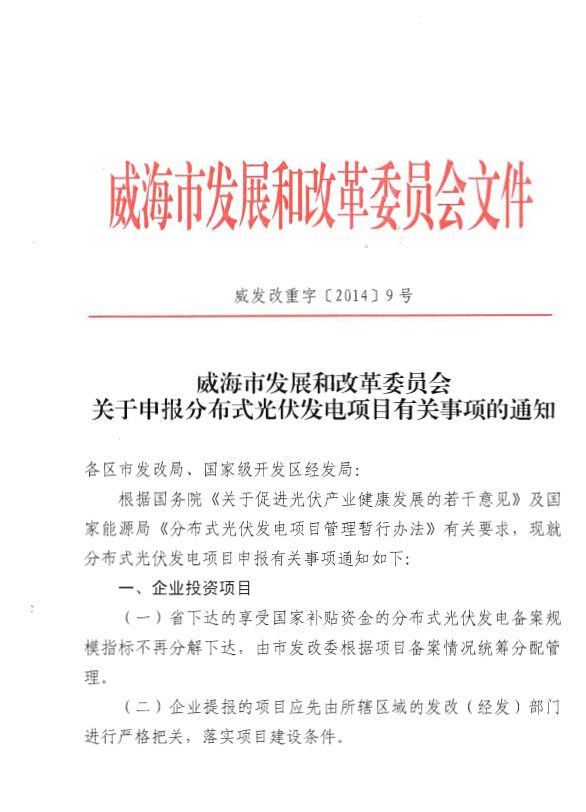 威海市发展和改革委员会关于申报分布式光伏发电项目有关事项的通知
