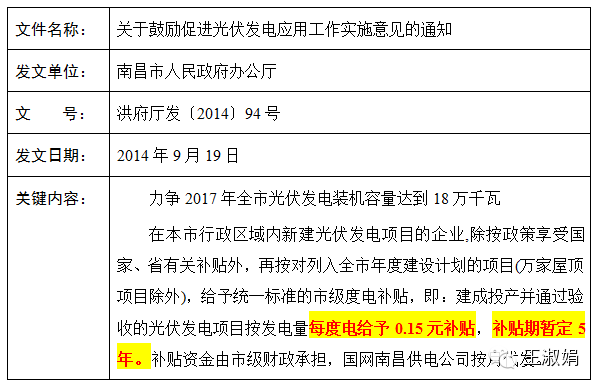在国家级、省级补贴之上,南昌市也提供了市级补贴,即每度电给予0.15元补贴,补贴期暂定5年;则前5年的分布式度电补贴为0.78元/kWh,地面电站为1.35元/kWh。