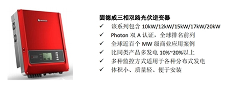 中电云商—光伏易携手固德威光伏逆变器,旨在提供优质的光伏系统产品、方案和服务,致力于推动分布式光伏发电在全球的应用与发展,倡导绿色健康的生活方式。该400KW的分布式屋顶项目共使用固德威20KW三相双路光伏逆变器14台,15KW逆变器3台,10KW逆变器8台。(产品型号:GW20K-DT,GW15K-DT,GW10K-DT)