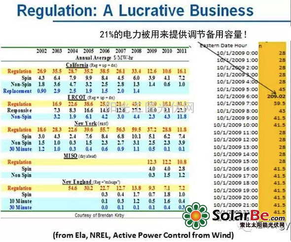 要满足平衡电网的需求,调节备用容量在辅助服务市场将是收益非常可观的一项服务。通常电力市场在调节备用容量服务上的支出比购买能源本身高很多,而且随着更多新能源并入电网,这种花费将更加频繁。艾拉举例说,现如今备用容量市场已达到每千瓦时$0.21(每兆瓦时$209.02)。