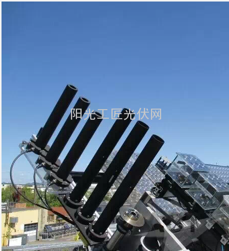 图1:位于Fraunhofer 太阳能研究所屋顶上的太阳光跟踪装置。利用各种气象传感器可使CPV模块在 ±0.1°的精度范围来连续跟踪太阳光的入射角度。