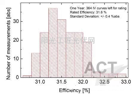在标准测试条件下,将测量到的单元电池的电流与器件的总电流进行区分,从而可以计算出与三个子电池相关联的三个太阳光频谱波段的有效辐射。在采用单元电池作为传感器进行测量的基础上,可以将太阳光的频谱得以参数化,运用所有的这些标准得到的平均额定模块效率为31.6%,其标准差为0.4%,这个结果已经去除了DNI、环境温度、风速和频谱分布等条件的影响。我们发现有必要对频谱条件进行更为严格的数据筛选,以降低它对额定效率不确定性的影响。与此同时,至少对于这种PV模块来说,模块效率对其它环境参数的依赖将会小很多。