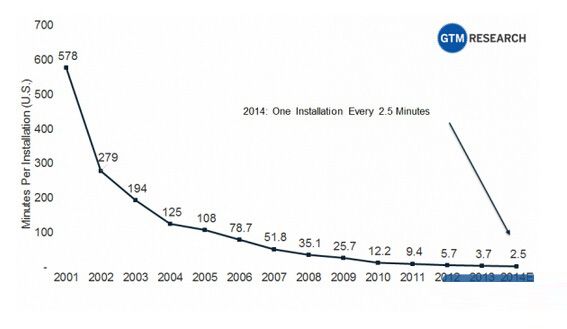 索比光伏网讯:近日,美国市场研究机构GTM Research最新报告指出,近年来美国光伏市场成长快速。2013年平均每3.7分钟安装一组光伏系统,而2014年则成长到平均每2.5分钟,就完成一组光伏系统的安装,装机整体投资额相当于15亿美元。