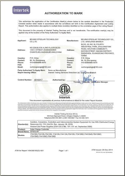 索比光伏网讯:近期北京汇能精电科技股份有限公司的iTracer系列MPPT控制器顺利通过ETL安全认证,取得了北美市场的准入证。