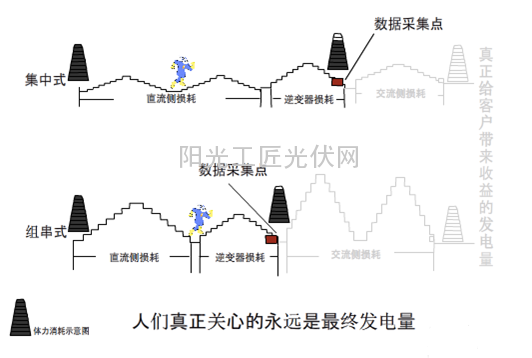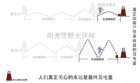 对于集中式逆变器方案而言,第一个过程直流侧要经过直流线缆、直流汇流箱及逆变器三座山,而组串型方案直流侧只经过直流线缆和逆变器两座山,所以在这个过程集中型方案消耗的体力多点,也就是说我们看到的逆变器上的数据组串型剩的多。但是在第二个过程,由于集中型方案交流侧的山只有线缆,而组串型还有汇流箱和线缆两座山,而且由于组串型逆变器位置分散,距离箱变远,因此爬山体力消耗远大于集中式逆变器。所以最后集中式剩余的体力大于组串式。这个最终剩余的体力才对我们最有价值。