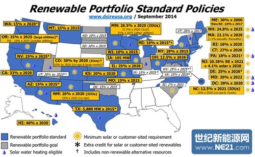 实施RPS法的州及其目标(图:北卡罗来纳州清洁能源技术中心)索比光伏网 https://news.solarbe.com/201501/25/201174.html