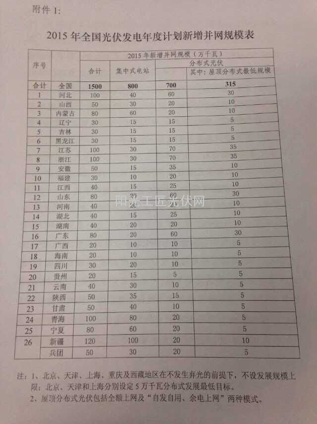 网络流传《2015年度全国光伏年度计划新增并网规模表》,经求证,应该为征求意见稿,最终具体数据仍需能源局最终确认。《规模表》中数据具有一定的参考意义,计划2015年全国新增并网规模15GW,其中集中式电站8GW,分布式7GW(其中屋顶分布式不低于3.15GW),特别提出北京、天津、上海、重庆及西藏地区在不发生弃光的前提下,不设发展规模上限。