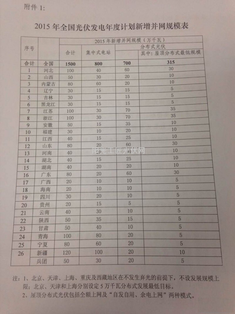 一,为稳定扩大光伏发电应用市场,2015年全国新增光伏发电并网容量目标为1500万千万(15GW)左右,其中集中式光伏电站800万千万,分布式光伏700万千万。综合考虑屋顶分布式光伏发电项目的特点和各地区的建设条件,对各地区提出最低任务指标,但不设年度规模上限。