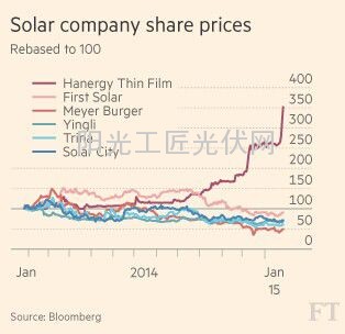在香港上市的汉能薄膜发电集团(Hanergy Thin Film Power Group)市值高达180亿美元,过去三年里取得了令人瞩目的利润水平,股价自2014年初以来上涨了3倍多。根据《福布斯》(Forbes)的统计,汉能集团创始人李河君因此成为中国第五大富豪。