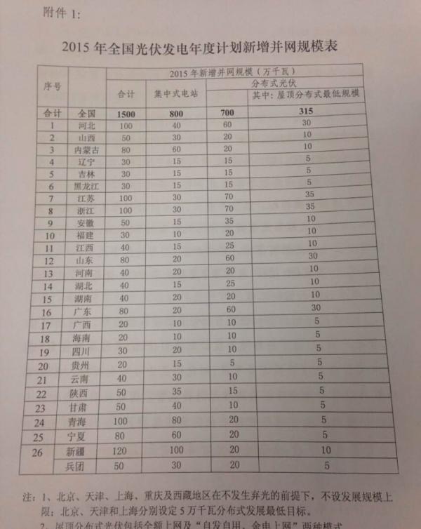 网络流传《2015年度全国光伏年度计划新增并网规模表》,经求证,应该为征求意见稿,最终具体数据仍需能源局最终确认。《规模表》中数据具有一定的参考意义,计划2015年全国新增并网规模15GW,其中集中式电站8GW,分布式7GW(其中屋顶分布式不低于3.15GW),特别提出北京、天津、上海、重庆及西藏地区在不发生弃光的前提下,不设发展规模上限。