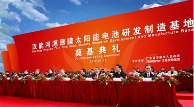 2011年11月19日,汉能广东河源光伏硅基薄膜太阳能电池正式投产,2012年底,李河君高调宣布,汉能集团已投产的8大光伏基地总产能已经达到3GW(300千瓦),超越美国第一太阳能公司(FirstSolar),成为全球最大的薄膜太阳能企业以及太阳能发电系统集成商。