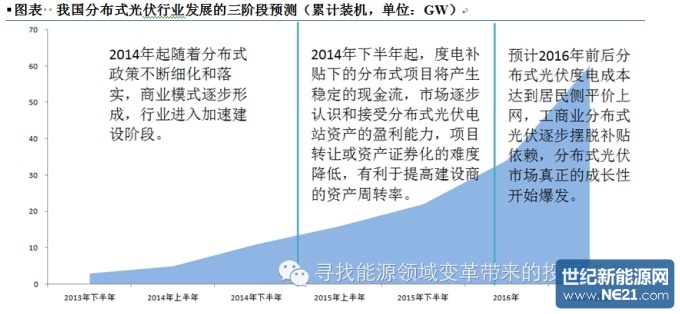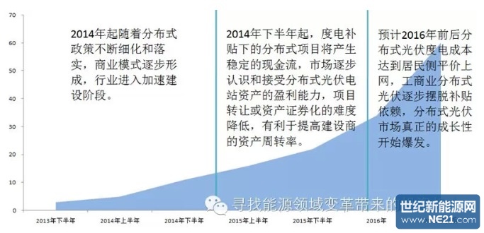 从14年年底到15年年初行业发生的一些变化来看,个人认为分布式光伏行业应该处于第一阶段发展过程中(建设加速),并逐步进入第二阶段(融资口逐步放开)。