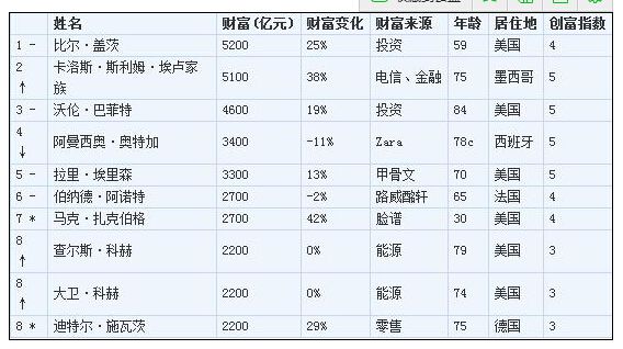 59岁的盖茨财富5200亿元,蝉联世界首富;斯利姆财富5100亿元紧随其后;巴菲特财富4600亿元位列第三。前三位财富增长总和达到3000亿元,平均每分钟增长60万元。