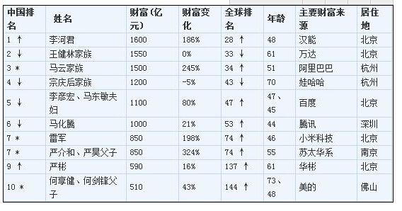 “新能源大王”48岁的李河君以财富1600亿元成为新一届中国首富,王健林在万达商业地产和万达院线成功上市后回到第二,马云因阿里巴巴股价下跌排至第三。