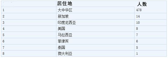 8位住在美国:金士顿的杜纪川和孙大卫、金鹰商贸的王恒、雅虎的杨致远、熊猫快餐的程正昌和蒋佩琪夫妇、仙妮蕾德的陈得福、HTC的王雪红、陈文琦夫妇和BBK的段永平。