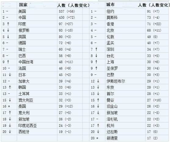 美国和中国独占鳌头,分别拥有537位和430位十亿美金富豪,几乎占据了今年胡润全球富豪榜的半壁江山。中国有72位新上榜,主要得益于中国股市的走高;其次是美国,有56位新上榜。印度增加27位,首次闯入前三,取代俄罗斯。