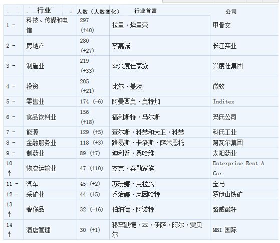 科技行业第二年成为上榜富豪财富的主要来源,297人,比去年增加40人。其次是房地产、制造业、投资和零售业。而房地产是上榜中国富豪最主要的财富来源,其次是制造业和科技行业。30岁的扎克伯格财富增长42%,闯进了榜单前十位。