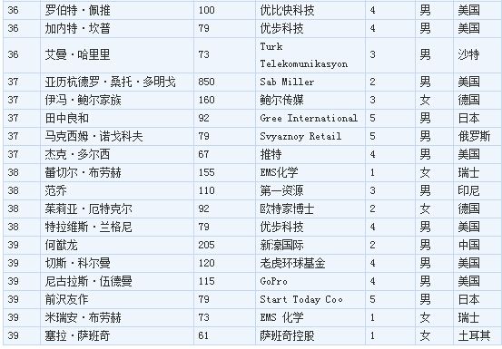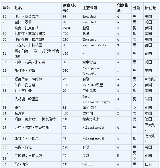 40位上榜富豪不到40岁,其中22位是白手起家。Snapchat的创始人23岁的斯皮格尔和25岁的鲍比˙墨菲,摘得最年轻的十亿美金富豪头衔。中国有4位,其中汉鼎的王麒诚、吴艳夫妇是白手起家的。
