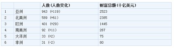 56%的新晋上榜富豪居住在亚洲。亚洲超过北美,产生了191位新晋上榜富豪,总人数升至943人,而北美地区这一人数为589人,欧洲为401人,位居其次。