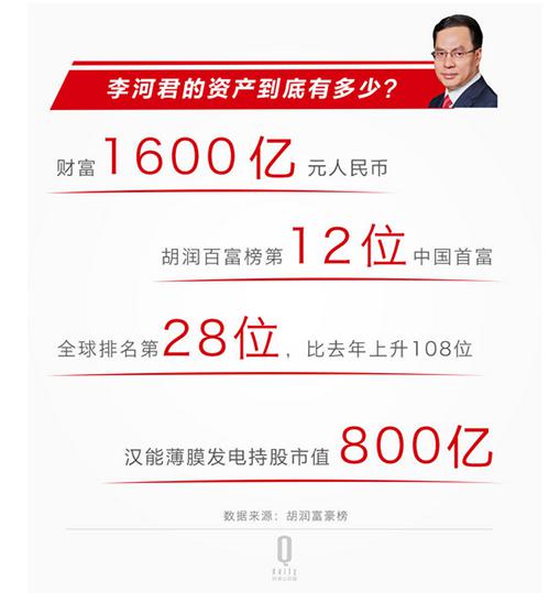 经历了两次暴富后的李河君,他的财富主要来自哪里?根据榜单介绍,他的财富主要包括其香港上市公司汉能薄膜发电持股的800亿市值。榜单统计时间截止前的收盘股价、总股本、持股份额相乘,得到就是这部分财富。