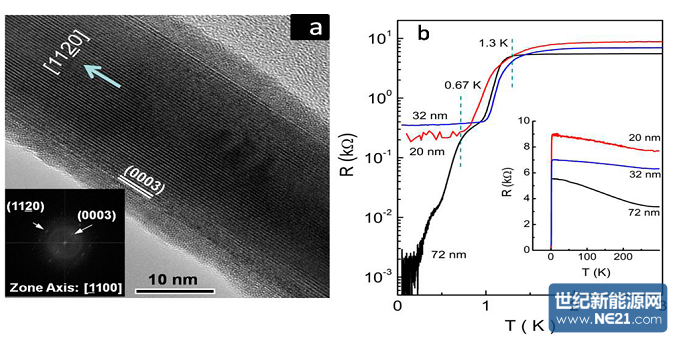 (左)铋纳米线的高分辨电镜照片;(右)不同直径Bi纳米线电阻随温度变化曲线