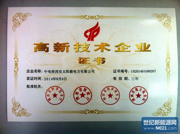 中电投太阳能公司于2014年年初积极准备高新技术企业申报的相关材料,通过网上填报、提交材料等程序顺利通过初审,8月初接受了航天国税局的复审,9月份被认定为2014年陕西省第一批高新技术企业,并于2015年2月11日授予证书。