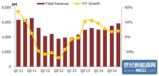2014年四季度,随着组件出货量的快速增长至8.8 GW,全球20大组件供应商的组件销售收入与去年同比增长12%。2014全年这20大组件厂商的组件销售收入则高达214亿美金。
