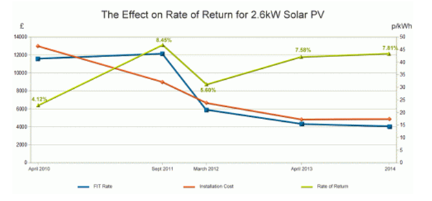 Green Bsiness Watch的编辑Alastair Kay评论道:“我们希望将度电补贴费率、成本降低、电价增长等多重因素对太阳能系统投资的影响进行比较。从比较结果可以很清楚地看出现今家用太阳能系统能提供比2010年刚推出度电补贴的时候更诱人的回报率。”