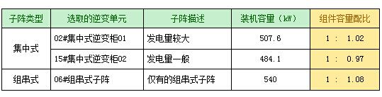 本次选取的集中式逆变单元为02#集中式逆变柜01,发电量较好,与组串式06#组串式子阵,为客观对比分析集中式子阵与组串式子阵的发电量,排除装机容量的影响,分析结果如下表所示: