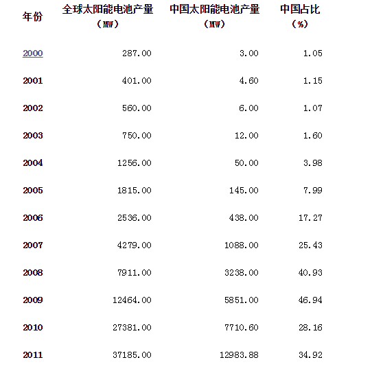 我国光伏企业则恰恰集中在产业链中游低附加值、低利润回报率的电池和组件制造环节,而在产业链上游的多晶硅和产业链下游的光伏发电环节,发展还比较滞后。自2007年起,我国的太阳能电池产量便稳居世界第一位,是全球名副其实的光伏电池制造中心,如表1所示。低端产业链生产环节的重复建设,对产能扩张的盲目追求,使得产量严重过剩,为光伏产业的发展埋下了极大隐患。