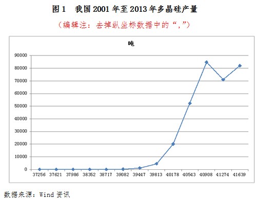 多晶硅是光伏产业最主要的原材料。我国多晶硅工业起步于上世纪50年代,但早期发展并不景气。近年来随着光伏市场的不断发展,我国多晶硅产业获得迅速发展,产量也得到迅速扩张,从2005年到2013年,我国多晶硅产量从41吨迅速增至8.2万吨,如图1所示。