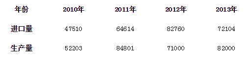 表2 2010—2013年我国高纯度多晶硅进口量与产量(单位:吨)
