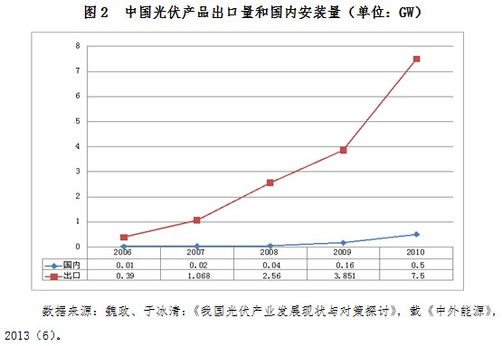 目前,我国光伏产业产能过剩的直接诱因是国内市场需求过小,国外光伏市场尤其是欧洲市场的发展对我国光伏产业有重大影响。我国光伏应用市场发展缓慢,并远远落后于我国光伏产业的发展。以2011年为例,我国当年太阳能电池产量为13GW,而新增的光伏发电装机容量仅约2.2GW,超过80%的太阳能电池要出口到欧洲、美国、日本等其他应用国家,对国外市场依赖性过大使得光伏产业缺乏稳定的市场基础,容易受到国际市场波动影响,产业发展具有较大脆弱性。