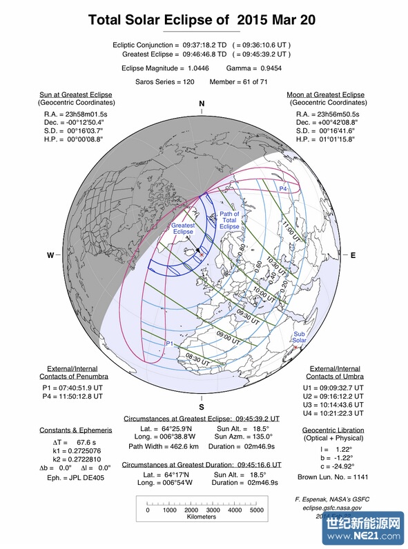 当月球于 3 月 20 日上午运行到太阳与地球之间,挡住来自太阳的部分或全部光线,将造成日全食或日偏食的现象发生。当天日食会先出现在英国,接着是格陵兰、欧洲大陆及俄罗斯,预计会遮蔽部分欧洲地区近 90% 的太阳光线,而除了欧洲外,北非部分地区的居民也可亲眼目睹约 90 分食的日蚀。