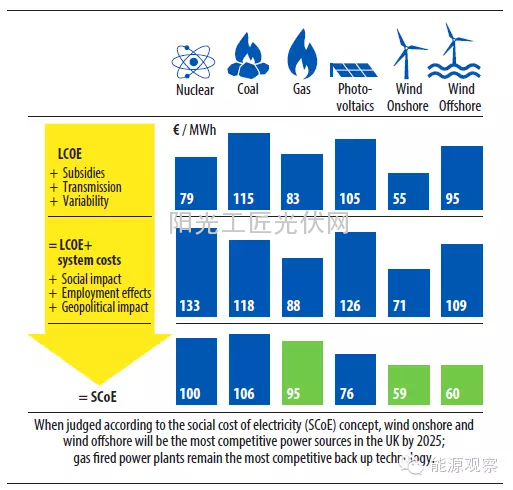 社会效应:燃煤发电要计算PM10和PM2.5的危害,核电要考虑重大事故的影响,核电和火电大量用水的外部性,以上这些都会为可再生能源加分,而传统能源减分。当然,发电厂周围的房地产也会因发电厂的噪音和污染而贬值,这也算发电厂负面的社会效应。