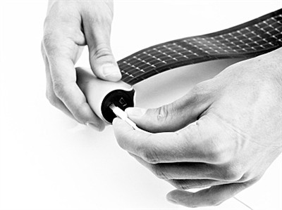 这款卷轴式太阳能充电板携带方便,收缩自如,铝制外壳轻巧而结实,很适合户外运动时携带;两端装有电源开关、USB接口以及用来显示电量的LED指示灯。