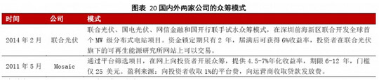 众筹属于股权融资,2014 年2 月国内联合光伏试水众筹模式,是光伏企业触网的第一步。联合光伏在首个项目达成后,计划下半年在全国范围内推广。美国的Mosaic 也推出光伏众筹平台,2011 年5 月成立以来已募集超过600 万美元,为超过18MW 项目提供融资服务。众筹模式的问题在于: