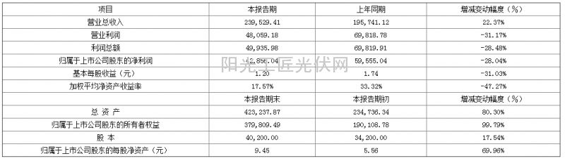 (一)报告期内,公司营业总收入较上年同期增长22.37%,营业利润、利润总额和归属于上市公司股东的净利润较上年同期分别下降31.17%、28.48%和28.04%。主要原因系报告期内公司主导产品EVA胶膜平均销售单价较上年同期下降,而主要原材料EVA树脂的平均采购单价较上年同期上升,致使公司在销售规模扩大的情况下,因产品单位毛利下降而导致营业利润、利润总额和净利润均有所下降;