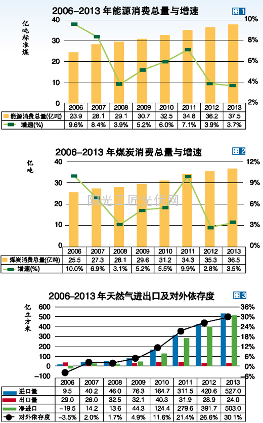 按照2013年我国一次能源消费总量37.5亿吨标准煤、煤炭消费总量36.5亿吨测算,要实现到2020年的控制目标,2014-2020年年均增幅必须分别控制在3.59%、1.92%以下。但从2006-2013年历史消费情况分析,控制难度很大。(见图1、2)